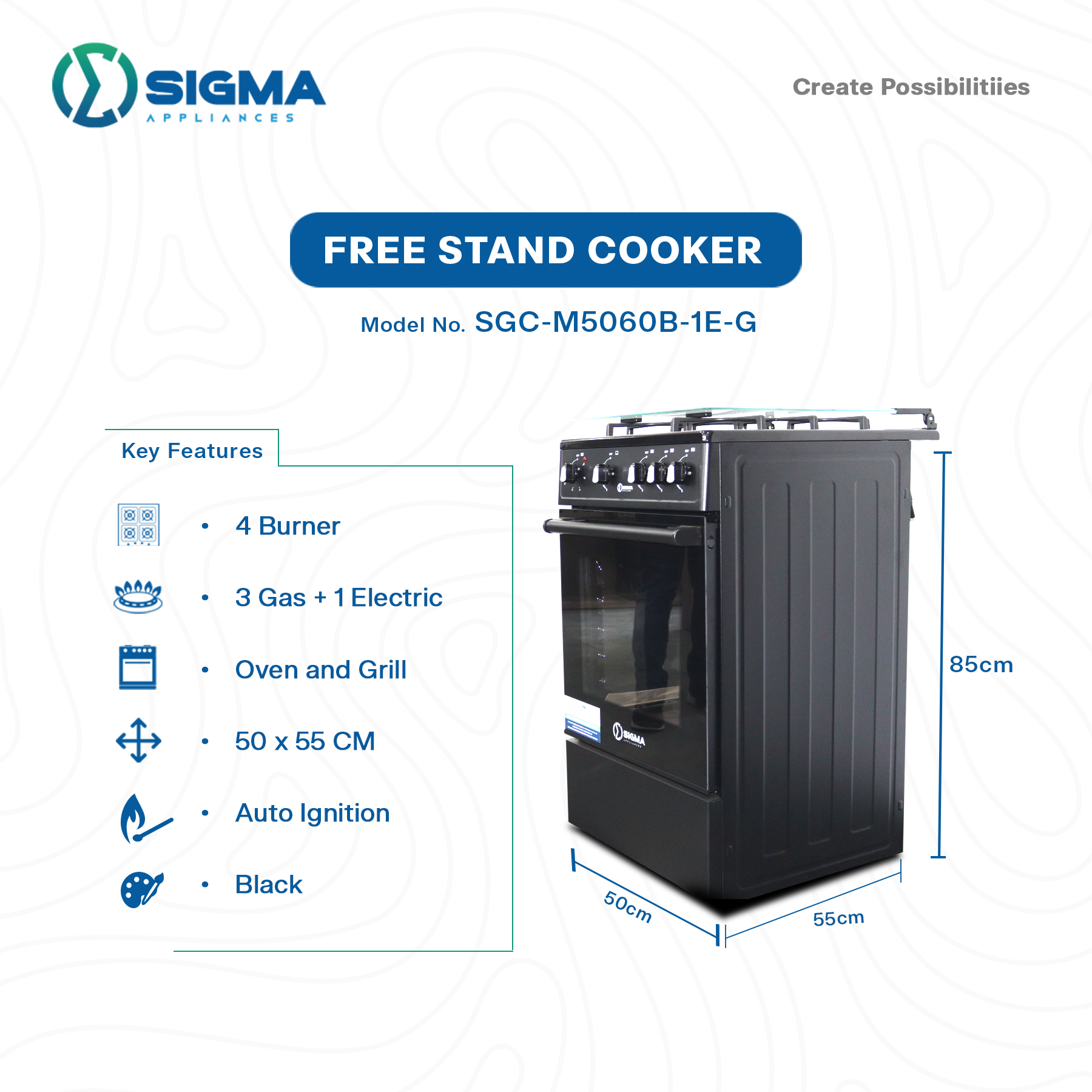 CSR 4 Burner with Oven and Grill (3 Gas + 1 Electric) Posted by Bquansah On 11/02/2026 0 comments SGC-M5060B-1E-G