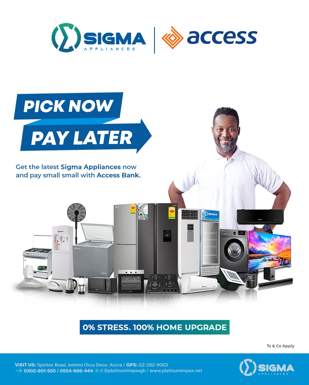 Sigma Appliances (Platinum Impex) has joined Access Bank Ghana's ``Pick Now, Pay Later`` (PNPL) scheme. This initiative is designed to remove the financial barrier to owning premium home appliances by offering customers a fast, digitised, and flexible way to shop.
